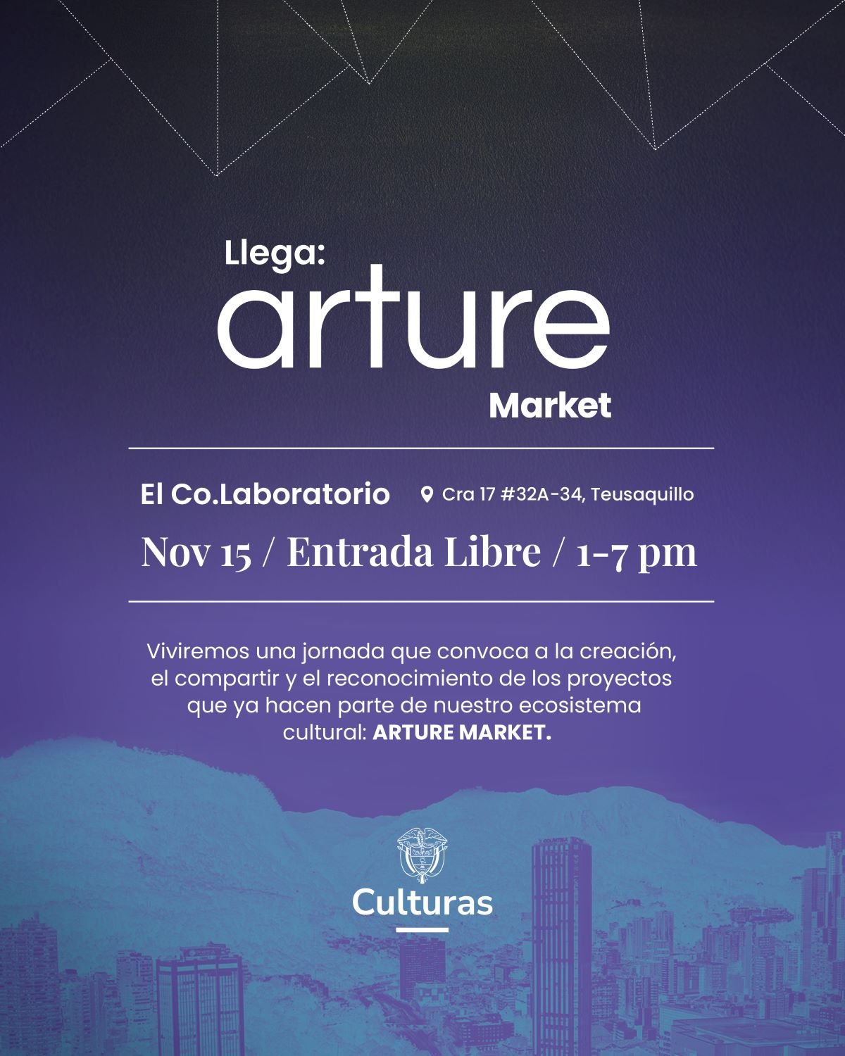 El.Colaboratorio Cra. 17 #32a-34, BogotáEl próximo 15 de noviembre, Arture Project te invita a vivir una jornada de arte, identidad y creación colectiva en el lanzamiento oficial de Arture Market, la nueva plataforma que conecta artistas, artesanos y emprendimientos culturales con el mundo. Este evento, apoyado por el Ministerio de las Culturas, las Artes y los Saberes de Colombia […]